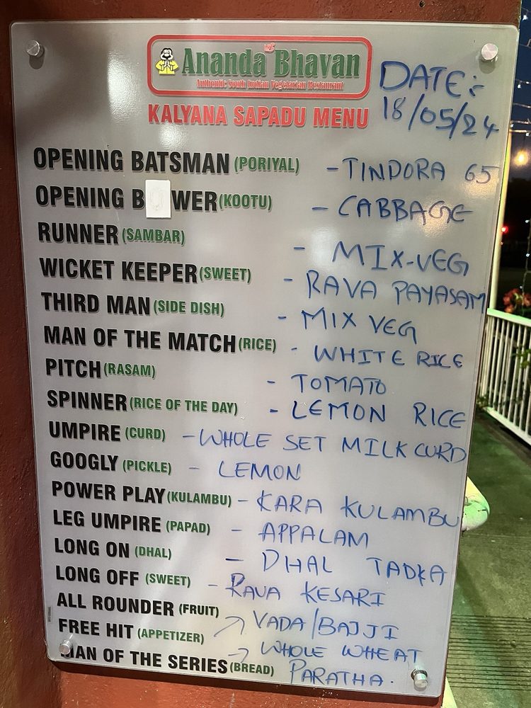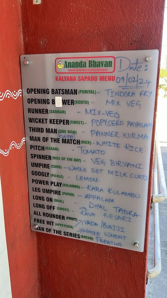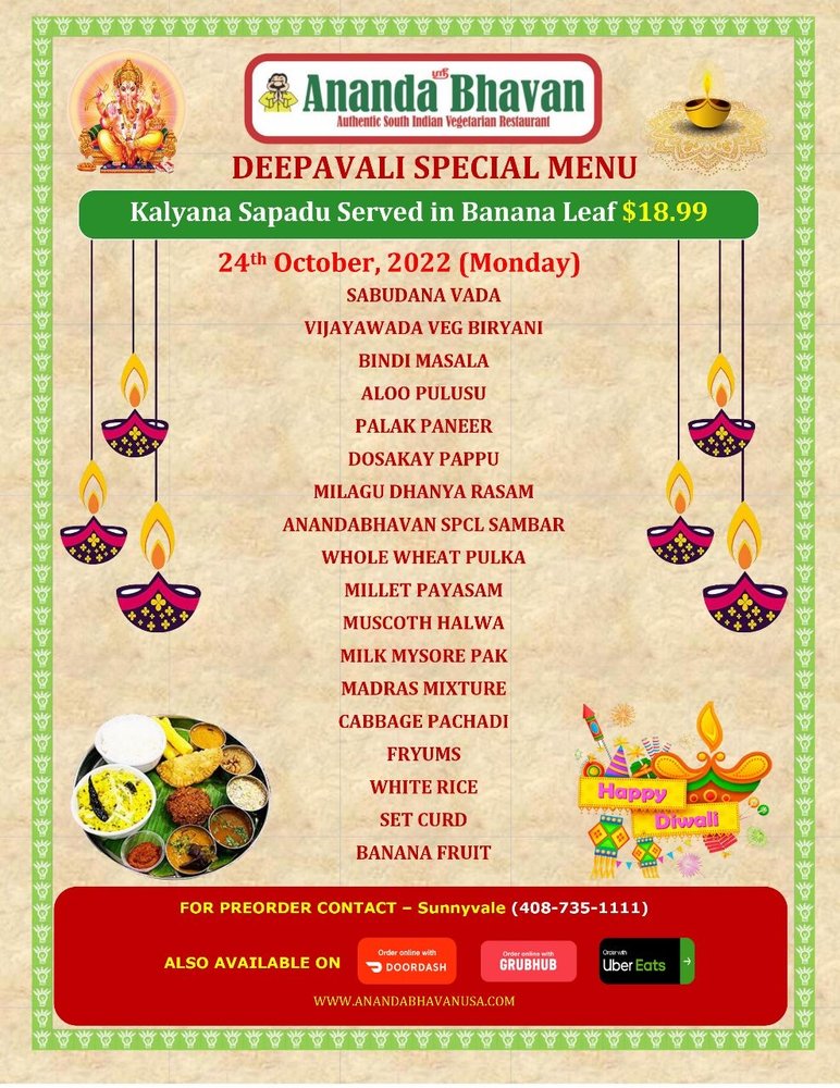 Carrot Beans - Poriyal, Spinach - Kootu, Mix-veg - Kurma, Dhal Tadka, Tamarind Rice, Sweet Pongal , Kesaribath, Sambar, Rasam, Yogurt, Appetizer, White Rice, Chapathi, Pickle, Papad, Kulambu.